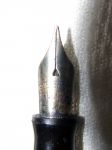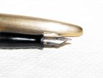 She has a couple of small dents not visible in the photos, a brassed spot on the top of the cap that you can see in the two middle photos, a twisted and solidified sac (that I was able to break apart and salvage the breather tube), and a 14K gold nib with a fair amount of flex to it. Not bad for $11, including shipping, two more pens, and a nice old Autopoint pencil.