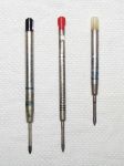 First is an old T-Ball Jotter refill from a late-1950s Jotter; second is from a window Jotter, with the overlay removed; last is the shorty refill from this Argentine pen. I'll have to order a "Pocket" refill from Nord-Mark and see if it's the same size.